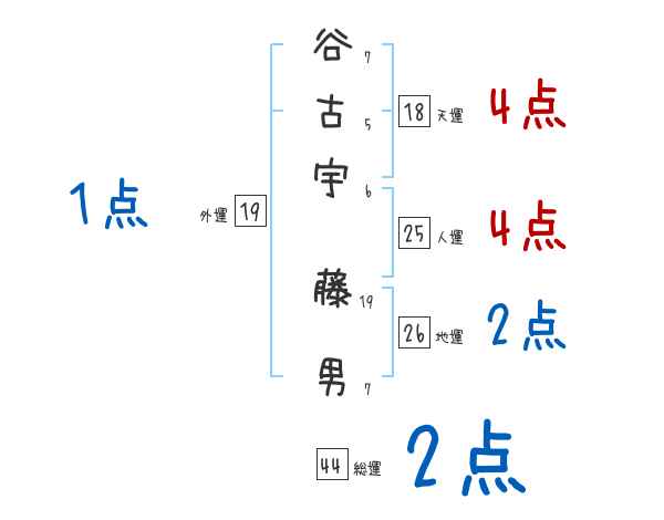 総運![]() | 谷古宇藤男さんの総運は44画の2つ星!誠実で慎重な性格。物事を考えすぎないように注意しましょう。 あなたの人生を表す1番重要な運勢です。生涯を通じて影響する総合運となり、主に50歳以降の晩年期に影響を及ぼします。 |