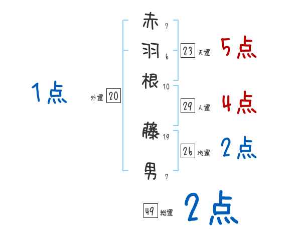 天運![]() | 赤羽根藤男さんの天運は23画の5つ星!想像力に優れ活力がある。一代で成功し名誉を手に入れる。 家系が持つ宿命的な運勢を表します。祖先から受け継いだ苗字ですので自分の力が及びません。家柄を象徴します。 |