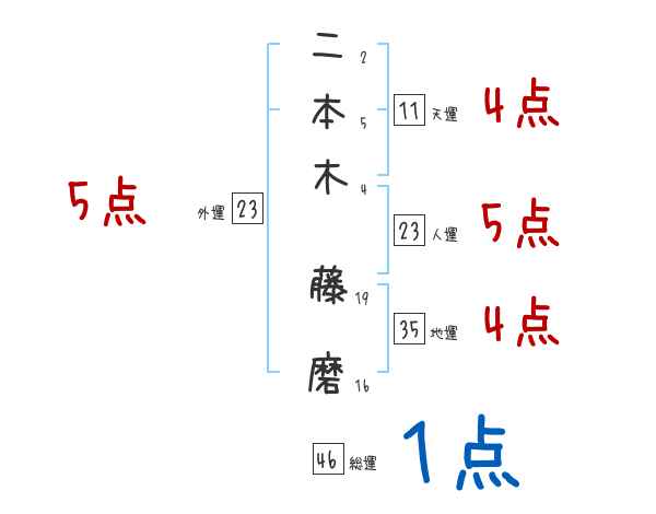 総運![]() | 二本木藤磨さんの総運は46画の1つ星!迷走することが多く苦労するかも。目先のことにとらわれないように。 あなたの人生を表す1番重要な運勢です。生涯を通じて影響する総合運となり、主に50歳以降の晩年期に影響を及ぼします。 |