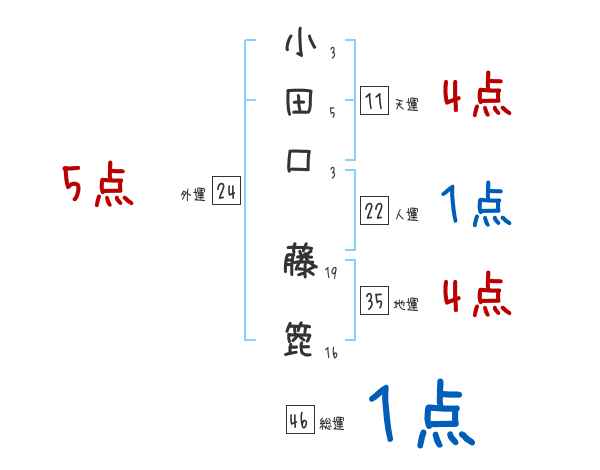外運![]() | 小田口藤箆さんの外運は24画の5つ星!家庭運が良く順調な人生。金運にも恵まれる。 生活面を象徴する運勢です。外部から受ける影響力を表し、結婚運、家庭運や職場、環境への順応性を表します。 |