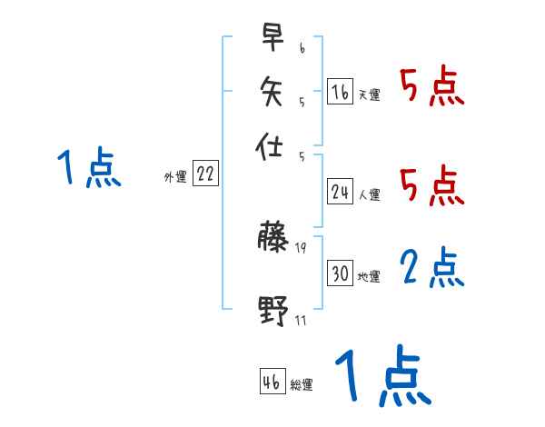 外運![]() | 早矢仕藤野さんの外運は22画の1つ星!努力することが苦手ないっぽう手先が器用。芸術性にも優れる。 生活面を象徴する運勢です。外部から受ける影響力を表し、結婚運、家庭運や職場、環境への順応性を表します。 |