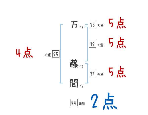 人運![]() | 万藤間さんの人運は32画の5つ星!柔軟性があり成功する。チャンスが多く金運が良い。 性格や才能などを表す2番目に重要な運勢です。人間関係や協調性、社会的な成功に影響します。主に20歳から50歳ぐらいまでの中年期の運勢を表します。 |