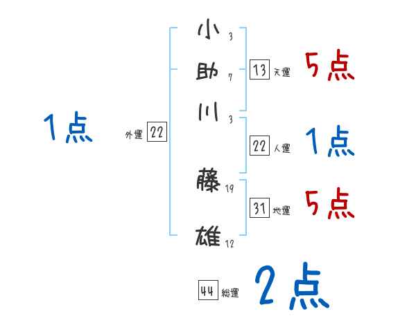 総運![]() | 小助川藤雄さんの総運は44画の2つ星!誠実で慎重な性格。物事を考えすぎないように注意しましょう。 あなたの人生を表す1番重要な運勢です。生涯を通じて影響する総合運となり、主に50歳以降の晩年期に影響を及ぼします。 |