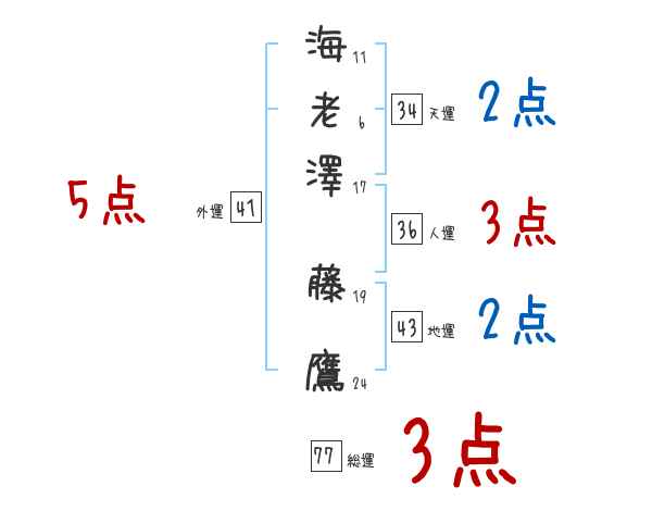 天運![]() | 海老澤藤鷹さんの天運は34画の2つ星!独創性に優れるが、自尊心が強く災難に注意しましょう。 家系が持つ宿命的な運勢を表します。祖先から受け継いだ苗字ですので自分の力が及びません。家柄を象徴します。 |