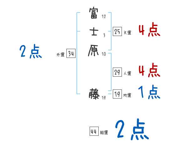 総運![]() | 富士原藤さんの総運は44画の2つ星!誠実で慎重な性格。物事を考えすぎないように注意しましょう。 あなたの人生を表す1番重要な運勢です。生涯を通じて影響する総合運となり、主に50歳以降の晩年期に影響を及ぼします。 |