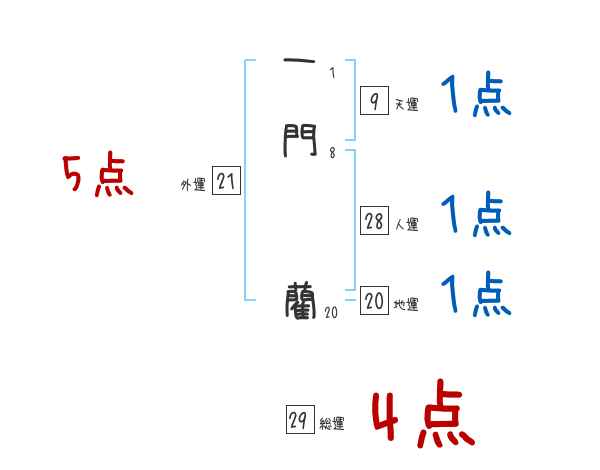 外運![]() | 一門藺さんの外運は21画の5つ星!統率力がある。独立し成功する。名誉を手に入れる。 生活面を象徴する運勢です。外部から受ける影響力を表し、結婚運、家庭運や職場、環境への順応性を表します。 |