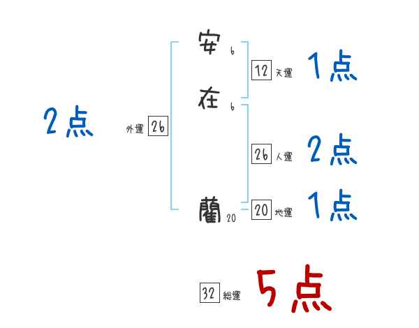 総運![]() | 安在藺さんの総運は32画の5つ星!柔軟性があり成功する。チャンスが多く金運が良い。 あなたの人生を表す1番重要な運勢です。生涯を通じて影響する総合運となり、主に50歳以降の晩年期に影響を及ぼします。 |
