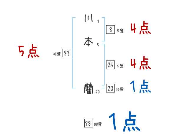 総運![]() | 川本藺さんの総運は28画の1つ星!家庭環境に注意。スポーツで活躍できる能力があるかも。 あなたの人生を表す1番重要な運勢です。生涯を通じて影響する総合運となり、主に50歳以降の晩年期に影響を及ぼします。 |