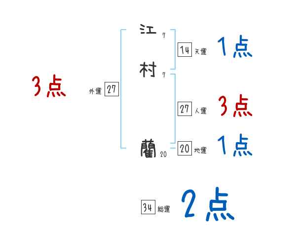 総運![]() | 江村藺さんの総運は34画の2つ星!独創性に優れるが、自尊心が強く災難に注意しましょう。 あなたの人生を表す1番重要な運勢です。生涯を通じて影響する総合運となり、主に50歳以降の晩年期に影響を及ぼします。 |