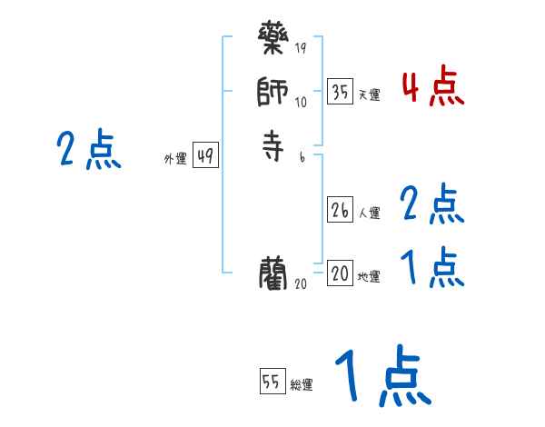 外運![]() | 藥師寺藺さんの外運は49画の2つ星!不安定な性格で明暗がある人生。周りの人には支援されやすい。 生活面を象徴する運勢です。外部から受ける影響力を表し、結婚運、家庭運や職場、環境への順応性を表します。 |