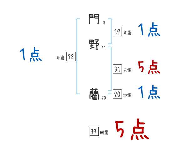 天運![]() | 門野藺さんの天運は19画の1つ星!優れた才能を持ちますが、協調性が足りないことも。周りの人と協力する事を意識しましょう。 家系が持つ宿命的な運勢を表します。祖先から受け継いだ苗字ですので自分の力が及びません。家柄を象徴します。 |
