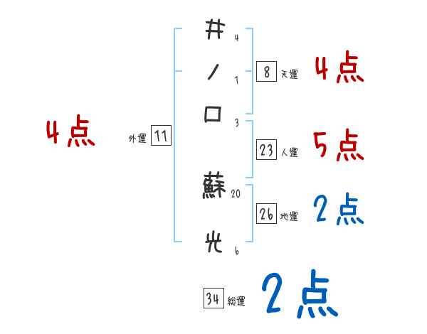 人運![]() | 井ノ口蘇光さんの人運は23画の5つ星!想像力に優れ活力がある。一代で成功し名誉を手に入れる。 性格や才能などを表す2番目に重要な運勢です。人間関係や協調性、社会的な成功に影響します。主に20歳から50歳ぐらいまでの中年期の運勢を表します。 |