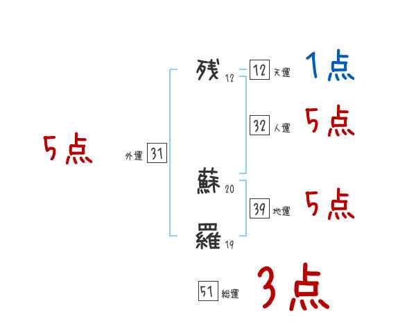 人運![]() | 残蘇羅さんの人運は32画の5つ星!柔軟性があり成功する。チャンスが多く金運が良い。 性格や才能などを表す2番目に重要な運勢です。人間関係や協調性、社会的な成功に影響します。主に20歳から50歳ぐらいまでの中年期の運勢を表します。 |
