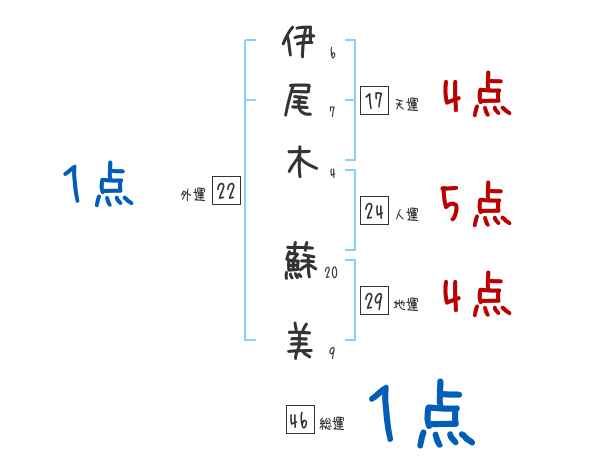 外運![]() | 伊尾木蘇美さんの外運は22画の1つ星!努力することが苦手ないっぽう手先が器用。芸術性にも優れる。 生活面を象徴する運勢です。外部から受ける影響力を表し、結婚運、家庭運や職場、環境への順応性を表します。 |