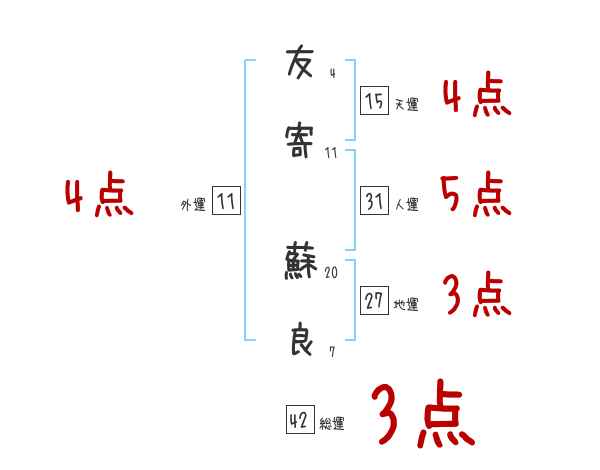 総運![]() | 友寄蘇良さんの総運は42画の3つ星!病気に注意。多芸であるが消極的でおとなしい。 あなたの人生を表す1番重要な運勢です。生涯を通じて影響する総合運となり、主に50歳以降の晩年期に影響を及ぼします。 |