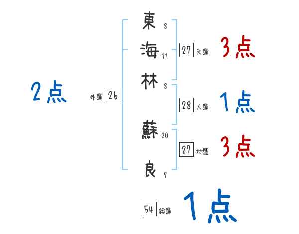 外運![]() | 東海林蘇良さんの外運は26画の2つ星!波瀾万丈かも。信頼できる人を大事にしましょう。 生活面を象徴する運勢です。外部から受ける影響力を表し、結婚運、家庭運や職場、環境への順応性を表します。 |
