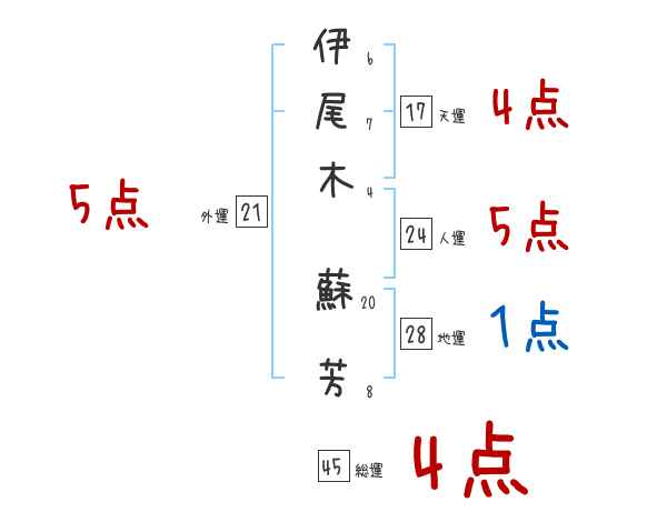 総運![]() | 伊尾木蘇芳さんの総運は45画の4つ星!もくもくと物事を進め達成する。地味な努力家。 あなたの人生を表す1番重要な運勢です。生涯を通じて影響する総合運となり、主に50歳以降の晩年期に影響を及ぼします。 |