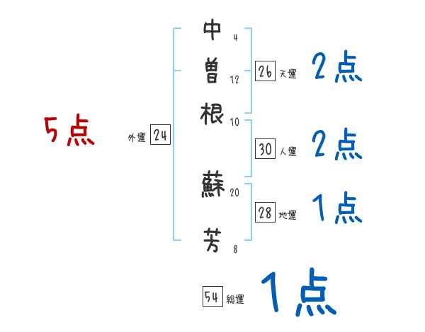 外運![]() | 中曽根蘇芳さんの外運は24画の5つ星!家庭運が良く順調な人生。金運にも恵まれる。 生活面を象徴する運勢です。外部から受ける影響力を表し、結婚運、家庭運や職場、環境への順応性を表します。 |