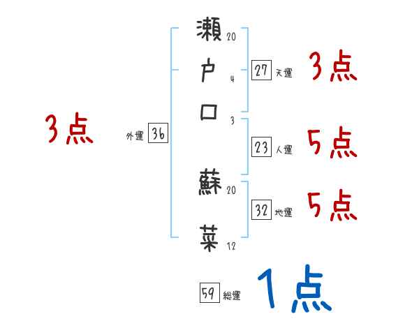 総運![]() | 瀬戸口蘇菜さんの総運は59画の1つ星!意志の弱さであきらめることが多いかも。粘り強さが必要。 あなたの人生を表す1番重要な運勢です。生涯を通じて影響する総合運となり、主に50歳以降の晩年期に影響を及ぼします。 |