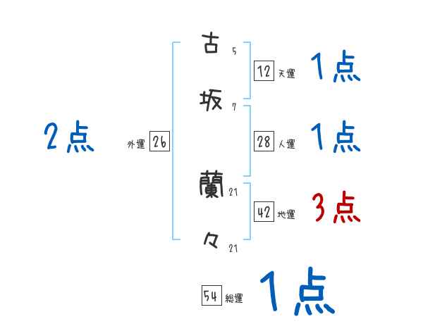 外運![]() | 古坂蘭々さんの外運は26画の2つ星!波瀾万丈かも。信頼できる人を大事にしましょう。 生活面を象徴する運勢です。外部から受ける影響力を表し、結婚運、家庭運や職場、環境への順応性を表します。 |
