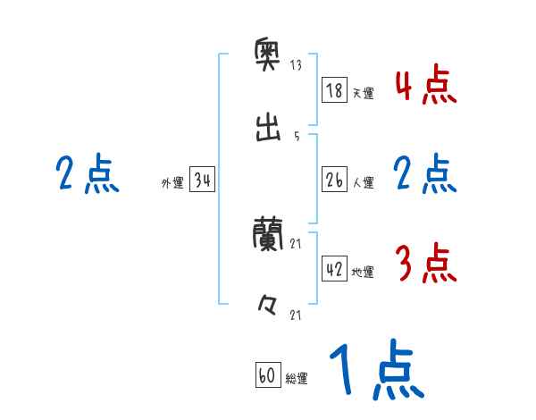 外運![]() | 奥出蘭々さんの外運は34画の2つ星!独創性に優れるが、自尊心が強く災難に注意しましょう。 生活面を象徴する運勢です。外部から受ける影響力を表し、結婚運、家庭運や職場、環境への順応性を表します。 |