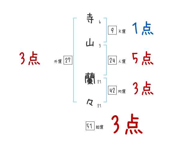 天運![]() | 寺山蘭々さんの天運は9画の1つ星!消極的で才能を発揮することが苦手なことも。周りの意見に耳を傾けましょう。 家系が持つ宿命的な運勢を表します。祖先から受け継いだ苗字ですので自分の力が及びません。家柄を象徴します。 |