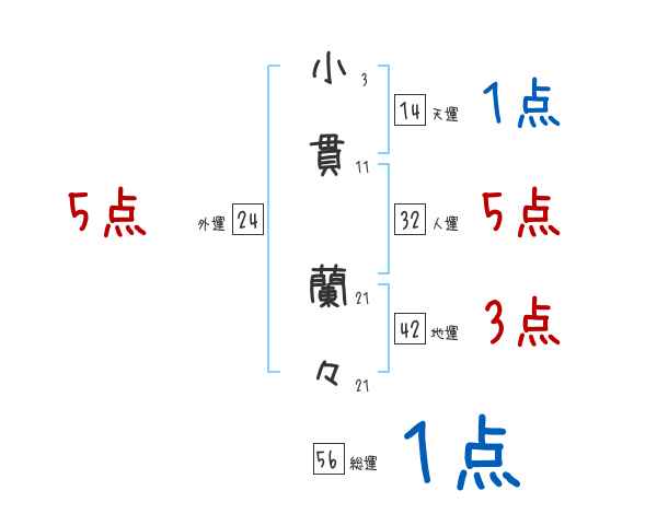 人運![]() | 小貫蘭々さんの人運は32画の5つ星!柔軟性があり成功する。チャンスが多く金運が良い。 性格や才能などを表す2番目に重要な運勢です。人間関係や協調性、社会的な成功に影響します。主に20歳から50歳ぐらいまでの中年期の運勢を表します。 |