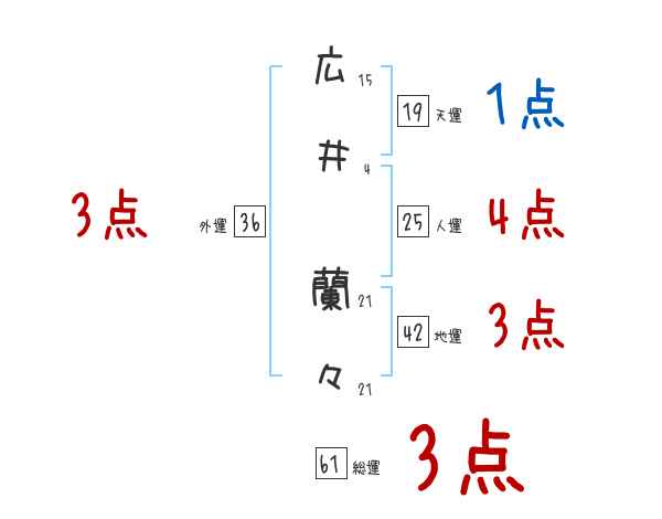 天運![]() | 広井蘭々さんの天運は19画の1つ星!優れた才能を持ちますが、協調性が足りないことも。周りの人と協力する事を意識しましょう。 家系が持つ宿命的な運勢を表します。祖先から受け継いだ苗字ですので自分の力が及びません。家柄を象徴します。 |