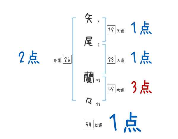 外運![]() | 矢尾蘭々さんの外運は26画の2つ星!波瀾万丈かも。信頼できる人を大事にしましょう。 生活面を象徴する運勢です。外部から受ける影響力を表し、結婚運、家庭運や職場、環境への順応性を表します。 |