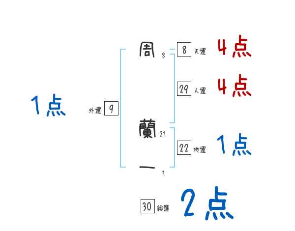 人運![]() | 周蘭一さんの人運は29画の4つ星!完全主義で才能がある。厳格な心の持ち主。 性格や才能などを表す2番目に重要な運勢です。人間関係や協調性、社会的な成功に影響します。主に20歳から50歳ぐらいまでの中年期の運勢を表します。 |