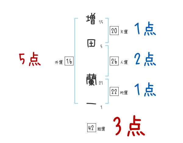 外運![]() | 増田蘭一さんの外運は16画の5つ星!人望が厚く大きく発展する。逆転成功が見える。 生活面を象徴する運勢です。外部から受ける影響力を表し、結婚運、家庭運や職場、環境への順応性を表します。 |