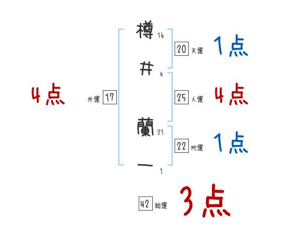 外運![]() | 樽井蘭一さんの外運は17画の4つ星!積極的な行動力。地位を気づき財産を手に入れる。純粋な心と直感力。 生活面を象徴する運勢です。外部から受ける影響力を表し、結婚運、家庭運や職場、環境への順応性を表します。 |
