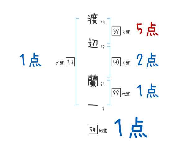 天運![]() | 渡辺蘭一さんの天運は32画の5つ星!柔軟性があり成功する。チャンスが多く金運が良い。 家系が持つ宿命的な運勢を表します。祖先から受け継いだ苗字ですので自分の力が及びません。家柄を象徴します。 |