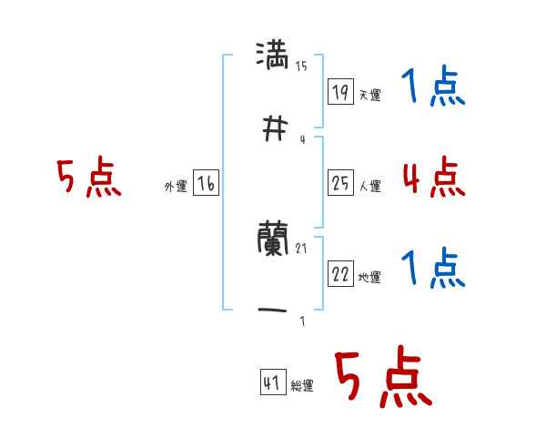 外運![]() | 満井蘭一さんの外運は16画の5つ星!人望が厚く大きく発展する。逆転成功が見える。 生活面を象徴する運勢です。外部から受ける影響力を表し、結婚運、家庭運や職場、環境への順応性を表します。 |