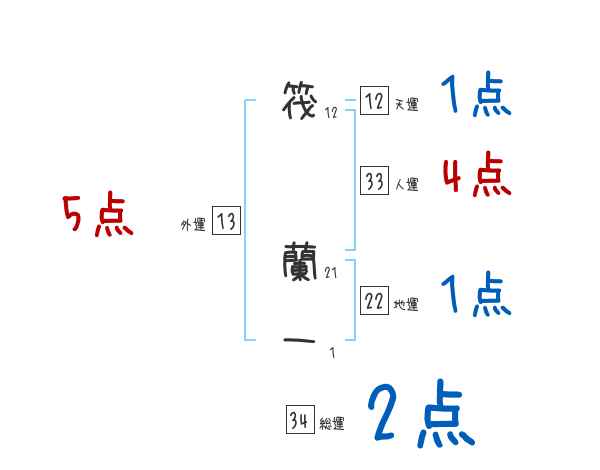 総運![]() | 筏蘭一さんの総運は34画の2つ星!独創性に優れるが、自尊心が強く災難に注意しましょう。 あなたの人生を表す1番重要な運勢です。生涯を通じて影響する総合運となり、主に50歳以降の晩年期に影響を及ぼします。 |