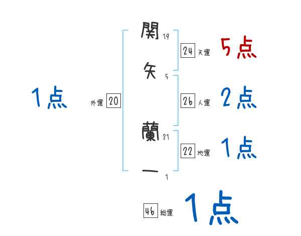 天運![]() | 関矢蘭一さんの天運は24画の5つ星!家庭運が良く順調な人生。金運にも恵まれる。 家系が持つ宿命的な運勢を表します。祖先から受け継いだ苗字ですので自分の力が及びません。家柄を象徴します。 |