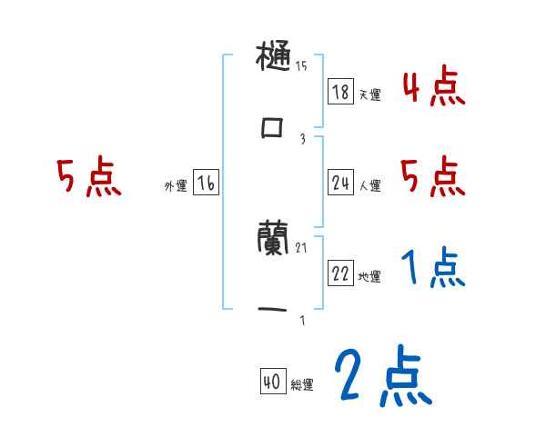 地運![]() | 樋口蘭一さんの地運は22画の1つ星!努力することが苦手ないっぽう手先が器用。芸術性にも優れる。 個性を表す基礎的な運勢です。性格形成や対人関係、行動力など家庭環境に影響されます。主に誕生してから20歳くらいまでの若年期の運勢を表します。 |
