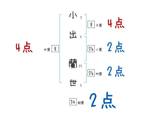 外運![]() | 小出蘭世さんの外運は8画の4つ星!勤勉家。根気強く努力し成功する。忍耐力がある。 生活面を象徴する運勢です。外部から受ける影響力を表し、結婚運、家庭運や職場、環境への順応性を表します。 |