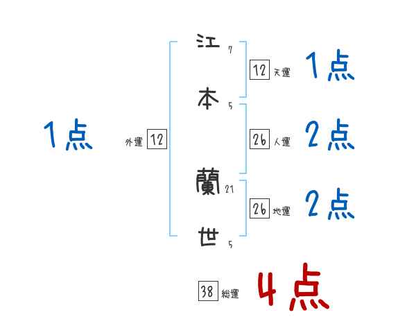天運![]() | 江本蘭世さんの天運は12画の1つ星!簡単な失敗で諦めてしまいやすいかも。着実に行動すると良いでしょう。 家系が持つ宿命的な運勢を表します。祖先から受け継いだ苗字ですので自分の力が及びません。家柄を象徴します。 |