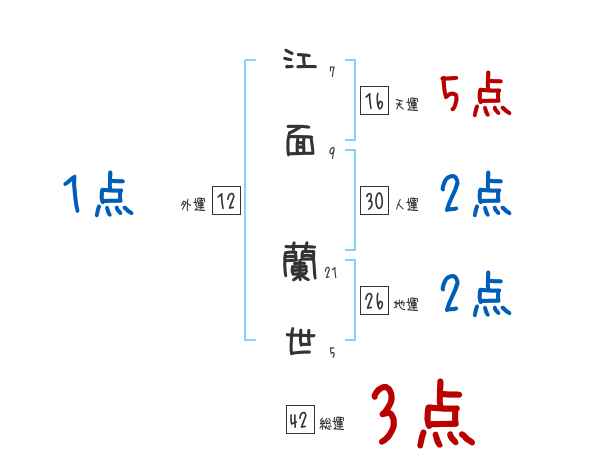 天運![]() | 江面蘭世さんの天運は16画の5つ星!人望が厚く大きく発展する。逆転成功が見える。 家系が持つ宿命的な運勢を表します。祖先から受け継いだ苗字ですので自分の力が及びません。家柄を象徴します。 |