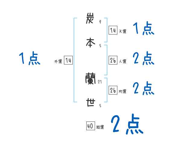 天運![]() | 炭本蘭世さんの天運は14画の1つ星!人に対して優しいがストレスを溜め込みがち。人間関係のトラブルを避けるよう気をつけましょう。 家系が持つ宿命的な運勢を表します。祖先から受け継いだ苗字ですので自分の力が及びません。家柄を象徴します。 |
