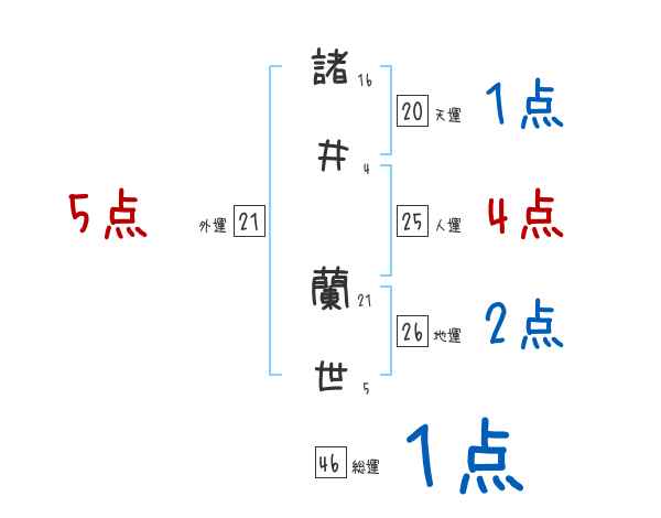 地運![]() | 諸井蘭世さんの地運は26画の2つ星!波瀾万丈かも。信頼できる人を大事にしましょう。 個性を表す基礎的な運勢です。性格形成や対人関係、行動力など家庭環境に影響されます。主に誕生してから20歳くらいまでの若年期の運勢を表します。 |