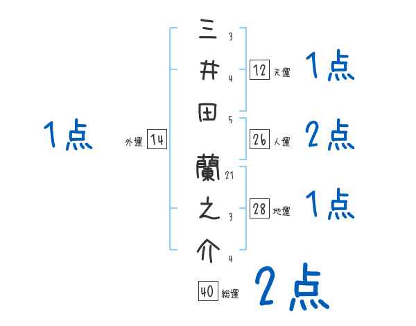 天運![]() | 三井田蘭之介さんの天運は12画の1つ星!簡単な失敗で諦めてしまいやすいかも。着実に行動すると良いでしょう。 家系が持つ宿命的な運勢を表します。祖先から受け継いだ苗字ですので自分の力が及びません。家柄を象徴します。 |