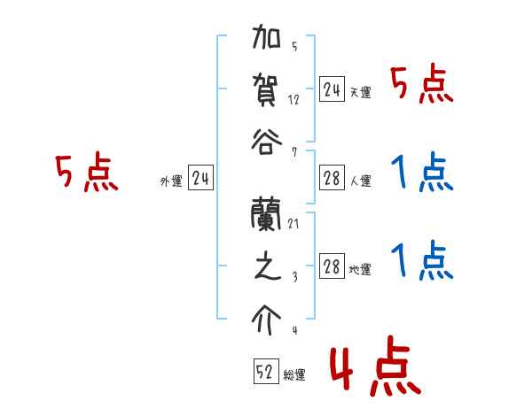 外運![]() | 加賀谷蘭之介さんの外運は24画の5つ星!家庭運が良く順調な人生。金運にも恵まれる。 生活面を象徴する運勢です。外部から受ける影響力を表し、結婚運、家庭運や職場、環境への順応性を表します。 |