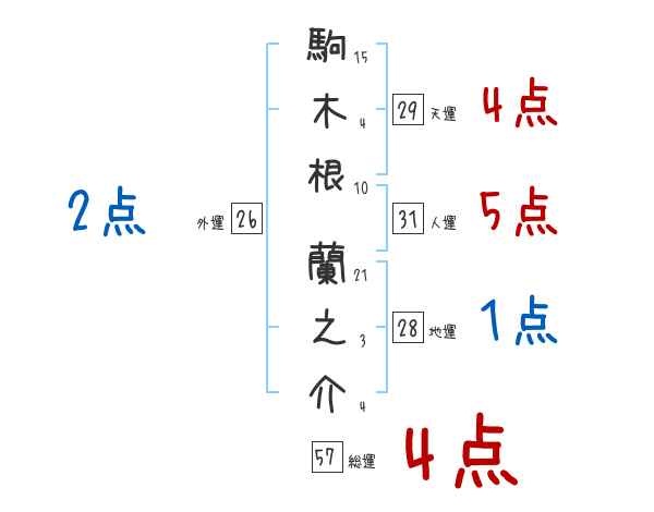 天運![]() | 駒木根蘭之介さんの天運は29画の4つ星!完全主義で才能がある。厳格な心の持ち主。 家系が持つ宿命的な運勢を表します。祖先から受け継いだ苗字ですので自分の力が及びません。家柄を象徴します。 |