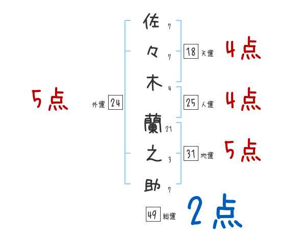 総運![]() | 佐々木蘭之助さんの総運は49画の2つ星!不安定な性格で明暗がある人生。周りの人には支援されやすい。 あなたの人生を表す1番重要な運勢です。生涯を通じて影響する総合運となり、主に50歳以降の晩年期に影響を及ぼします。 |