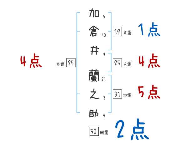 天運![]() | 加倉井蘭之助さんの天運は19画の1つ星!優れた才能を持ちますが、協調性が足りないことも。周りの人と協力する事を意識しましょう。 家系が持つ宿命的な運勢を表します。祖先から受け継いだ苗字ですので自分の力が及びません。家柄を象徴します。 |