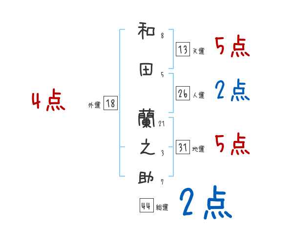 総運![]() | 和田蘭之助さんの総運は44画の2つ星!誠実で慎重な性格。物事を考えすぎないように注意しましょう。 あなたの人生を表す1番重要な運勢です。生涯を通じて影響する総合運となり、主に50歳以降の晩年期に影響を及ぼします。 |