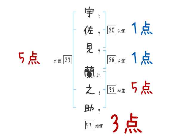 地運![]() | 宇佐見蘭之助さんの地運は31画の5つ星!社交性があり判断力に優れる。順風満帆な人生で円満な生活。 個性を表す基礎的な運勢です。性格形成や対人関係、行動力など家庭環境に影響されます。主に誕生してから20歳くらいまでの若年期の運勢を表します。 |