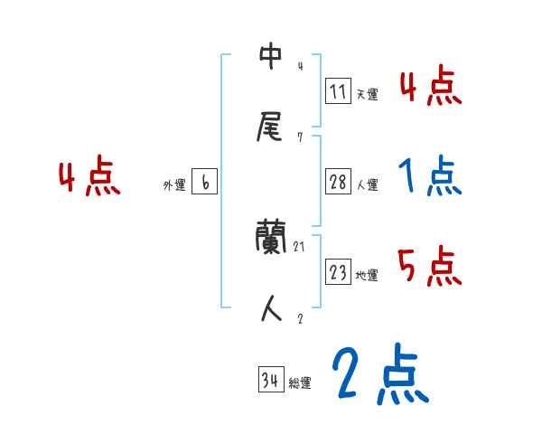 外運![]() | 中尾蘭人さんの外運は6画の4つ星!慎重な努力家で信頼を得る。誠実な精神で向上心に優れる。 生活面を象徴する運勢です。外部から受ける影響力を表し、結婚運、家庭運や職場、環境への順応性を表します。 |